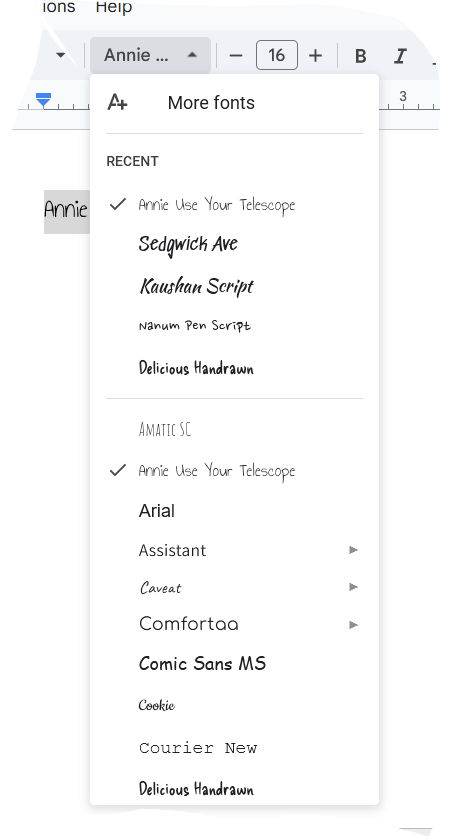 Next, my favorite thing about Google, is the fonts and how you can assign them. To start, you just want to write out something, or if you want to dive right in, go to fonts in the top menu and you can see here, you can expand them: